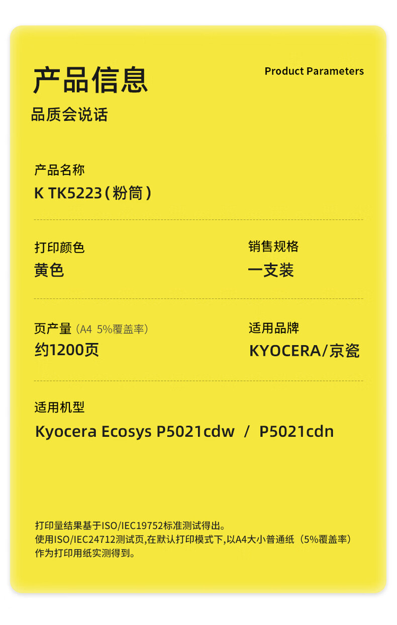 商品名称:科思特 K TK5223 粉盒 黄色(适用京瓷Kyocera Ecosys P5021cdw/P5021cdn)打印量1200页 专业版